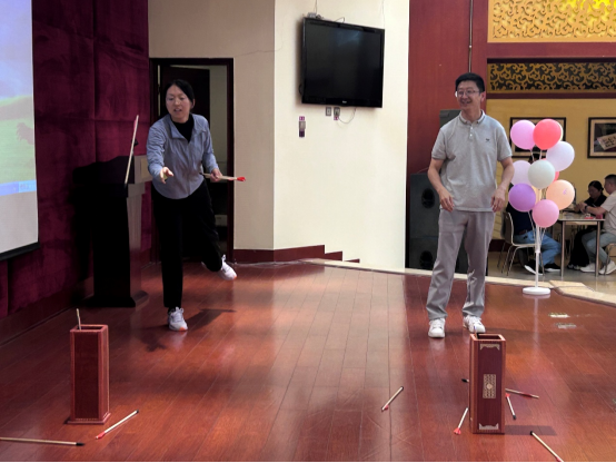 活动现场气氛热烈,欢声笑语不断。下午两点,一系列集趣味性、竞技性与传统文化于一体的游园活动正式拉开帷幕。在“巧猜灯谜”区,中英双语的谜题考验着老师们的智慧与学识;“趣味投壶”环节,大家纷纷执箭凝神,体验着“一矢中的”的古典雅趣;而在“夹乒乓球”和模拟射箭的挑战中,老师们则全神贯注,展现了平日在三尺讲台之外的敏捷与精准。各项游戏前人头攒动,加油声、喝彩声此起彼伏,充分展现了外院教职工积极向上、充满活力的精神风貌。